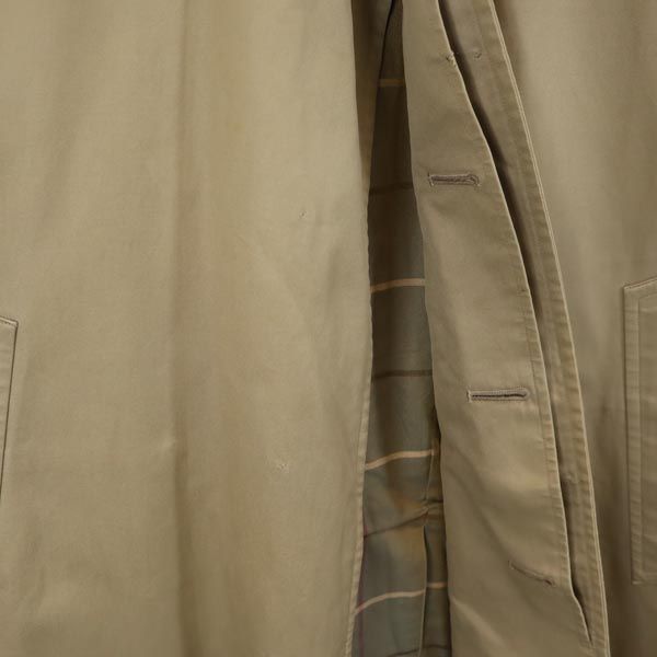 | 詳細 | 90年代のオールドのバーバリーになります。サイズが不明です。実寸を参考にお願いいたします。裏地にネーム刺繍あり。お写真ではマスキングテープにて目隠しさせて頂いております。裏地が劣化しており色褪せしております。ボタンが4つ欠損しております。袖に変色している箇所あり。古着にご理解の上ご購入をお願い致します。 |