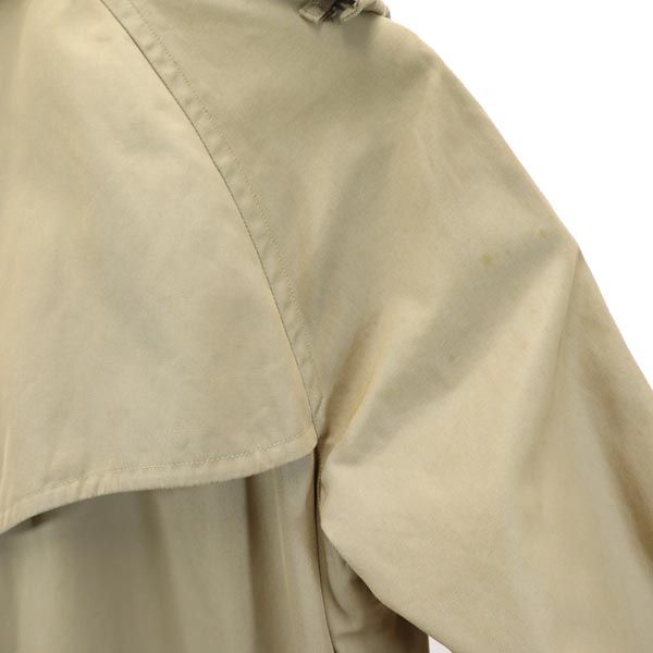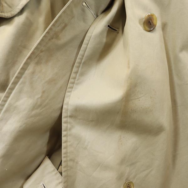 | 詳細 | 90年代のオールドのバーバリーになります。タグが薄くなっており、サイズが不明です。実寸を参考にお願いいたします。ライナーは付いておりません。全体的に着用によるスレや色褪せあり、袖や裾にシミ汚れあり、裾に濃いカラーの付着あり、変色している箇所あり。後ろ裾のボタンが欠損しております。古着にご理解の上ご購入をお願いいたします。 |
