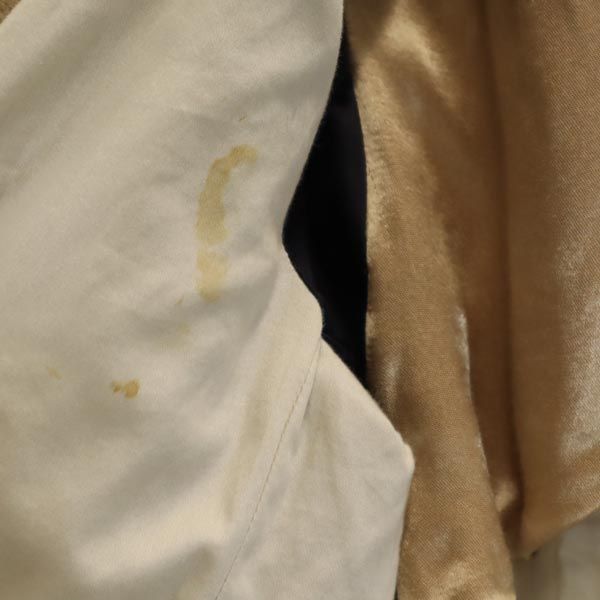 | 詳細 | 襟まわりに汚れあり。右袖ぐりの裏地にシミ汚れあり。着用による若干の毛羽立ちあり、それ以外は目立ったダメージはありません。 |