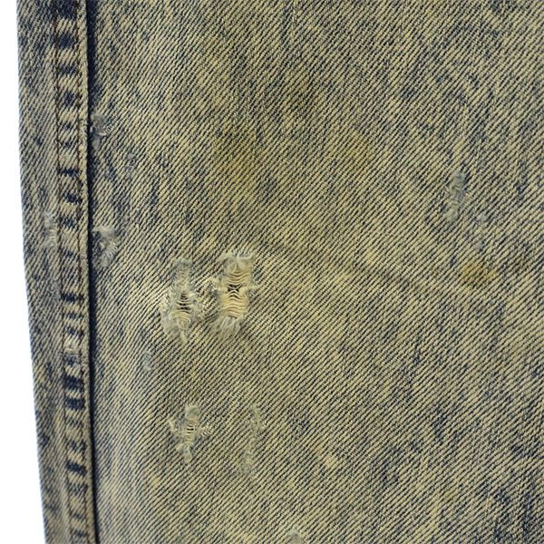 | 詳細 | 内タグの文字が薄くなっており、サイズ素材共に不明です。実寸を参考にお願いします。ポケットの袋に多少の毛玉と汚れが有ります。デニム特有のスレ、アタリがございます。全体的に汚れが有ります。所々にほつれと破れが有ります。他、特に気になるようなダメージはございません。 |